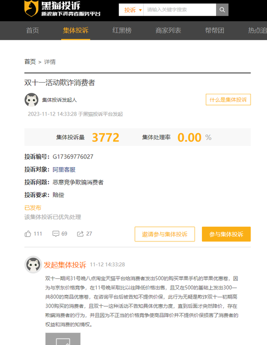未来网记者注意到,在黑猫投诉平台,有集体投诉显示,天猫在双十一大促最后2小时放出大额苹果优惠券,致使部分活动商品实际到手价比大促其他时段低200元-300元,并且不提供价保,不退差价。截至当前,相关集体投诉已累计达3772件,处理率为0。
