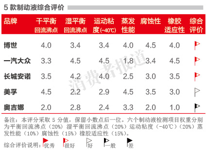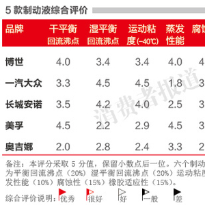 根据各项指标的综合表现,博世和一汽大众原厂制动液的品质最好,其次是中石化长城安诺制动液。同为外资品牌的美孚表现较差。而作为中国第一制动液生产基地的民营奥吉娜垫底。(如图)