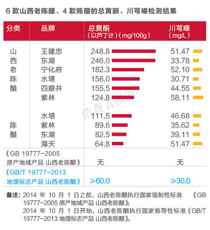 2014年10月,山西老陈醋新标准正式执行,为体现其特有的属性特征,新增“总黄酮”和“川芎嗪”作为其特征性指标。而从《消费者报道》的7品牌10款山西老陈醋、陈醋的检测结果来看,6款山西老陈醋的“总黄酮”、“川芎嗪”含量均能达到山西老陈醋新标准规定的“总黄酮”、“川芎嗪”含量。