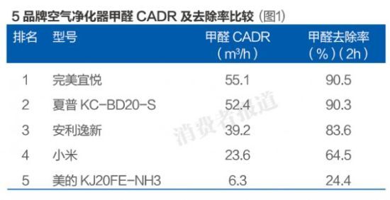 测试结果显示,5款净化器的甲醛去除率与CADR值排序一致,依次是完美、夏普、安利、小米和美的(如图1)。