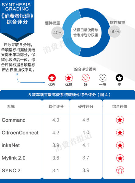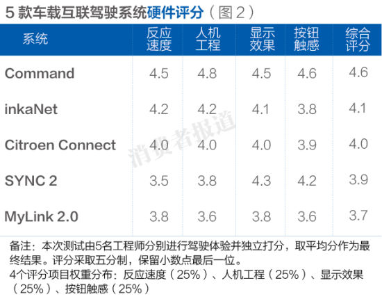 根据不同互联系统在本次测试中的表现,我们对其做出了综合评价,排第一的是Command系统,倒数第一的则是SYNC 2系统。(如图4)