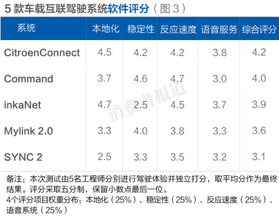 由于Command没有语音识别功能,所以在这一项上我们按照最低分3.0分计算,最终统计得出雪铁龙Citroen Connect排名第一,Command系统、inkaNet系统、Mylink 2.0系统、SYNC 2系统分别位列二三四五名。(如图3)