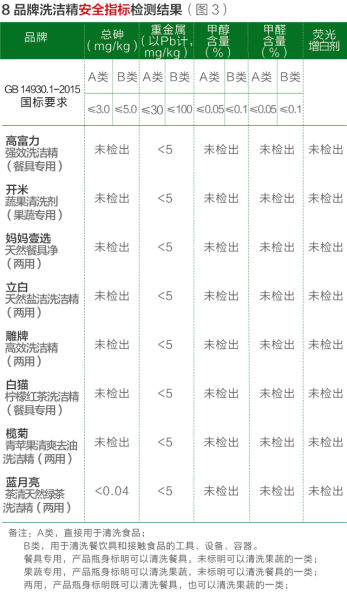 依据现行国标与即将实施的新国标,本刊本次送检的8款洗洁精安全指标全部合格,均没有检测出荧光增白剂。对照新国标中的分类要求可以看出,送检的8款洗洁精均属于A类,可以用于清洗果蔬。(如图3)