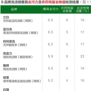 2015年11月,《消费者报道》向第三方检测机构送检了9款餐具、果蔬洗洁精(洗涤剂),测试其餐具去污力,农药残留去除效果。