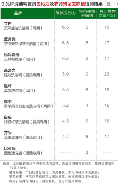 9款餐具果蔬洗洁精测评:比亚酶去农药残留值不达标
