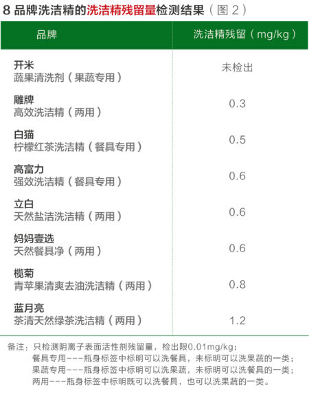 本刊此次测试8款产品的洗洁精阴离子表面活性剂残留量,仅有开米未检出(检出限为0.01mg/kg),其他7款或多或少都检测出了洗洁精残留。(如图2)