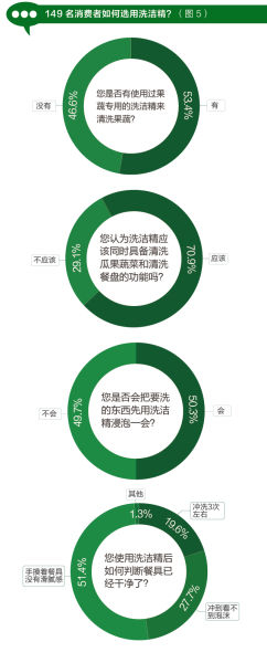 2015年10月,《消费者报道》对149名消费者有关洗洁精的问卷调查结果显示,53%的消费者会选择使用果蔬洗涤剂清洗果蔬。