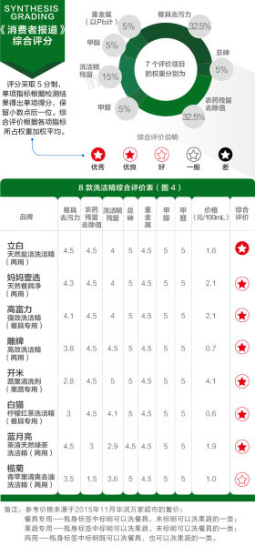 2015年11月,《消费者报道》向第三方权威检测机构送检9款餐具、果蔬洗洁精(洗涤剂),测试其餐具去污力,农药残留去除效果,此外也测试了洗洁精残留、甲醛、重金属等安全指标。