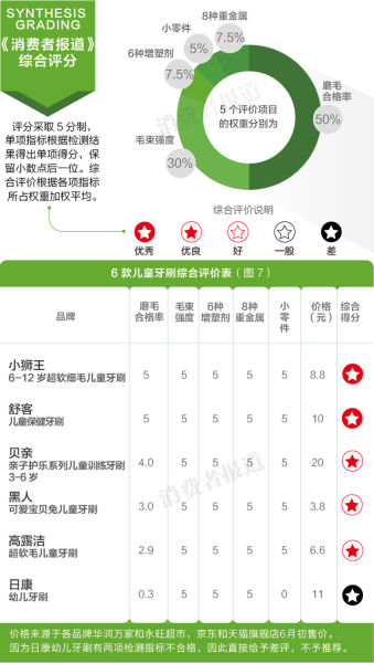 6款儿童牙刷质量的主要差异体现在磨毛合格率,小狮王、舒客表现优秀,而日康幼儿牙刷该指标不合格,本刊不予推荐。