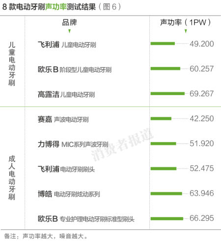 为了了解真实的噪音情况,本刊此次将这8款电动牙刷送往第三方检测机构对代表噪音大小的声功率进行测试。结果显示,旋转式的电动牙刷噪音较大,声波电动牙刷噪音较小。其中赛嘉声波电动牙刷更安静,高露洁儿童电动牙刷较吵。(如图6)