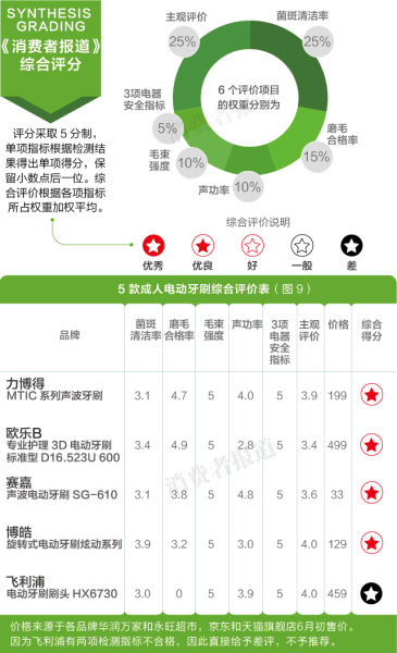 此外,本刊还送检了高露洁、飞利浦和欧乐B等3品牌儿童电动牙刷,以及力博得、博晧、赛嘉、飞利浦、欧乐B等5品牌成人电动牙刷,测试其清洁能力,刷毛质量、毛束强度以及电器安全等指标。