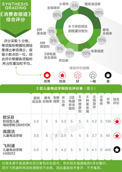 2015年12月,《消费者报道》(微信号:consumerreport)对14款电动牙刷和普通牙刷进行了对比测试,测试结果显示,日康幼儿牙刷和飞利浦的两款电动牙刷磨毛合格率不达标,且存在安全隐患,本刊不推荐。