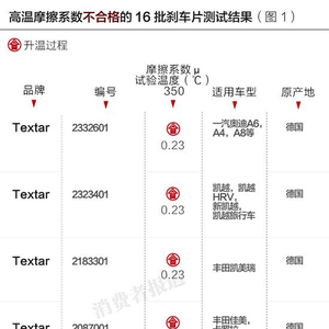 检测发现,有16批刹车片的高温摩擦系数不合格,其中德国进口的Textar盘式刹车片,总样品数8批,在350℃高温摩擦系数这个指标上全部不合格,不合格率为100%, 是这次抽样中单一品牌某一指标上问题最为突出的一个。