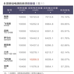 测试结果显示,一款国外品牌的移动电源电芯容量不达标,8款产品的有效放电量表现也差强人意。
