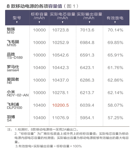 2016年1月,《消费者报道》向第三方权威检测机构送检了小米、魅族、品胜、羽博、飞毛腿、罗马仕、爱国者、飞利浦等8款标称容量在10000mAh左右的移动电源,依据国标GB 31241-2014《便携式电子产品用锂电子电池和电池组安全要求》,立足于消费者关注的“容量”、“充电速度”和“安全”三个方面进行对比检测。