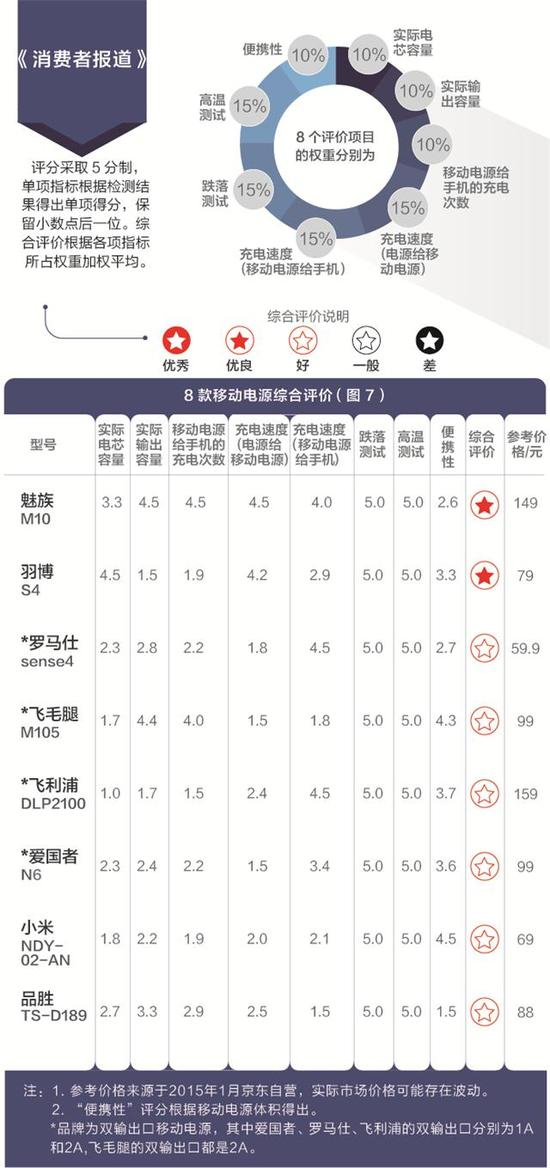 2016年1月,《消费者报道》从容量、充电速度、安全性三个方面对8款线上热销的移动电源进行了对比测试,另外还通过主观体验得出各样品的便携性数据。