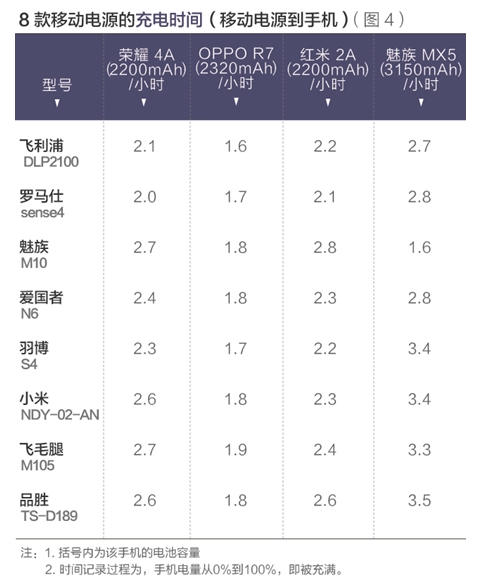 结果显示,魅族移动电源只有给魅族手机充电时才较快,只需1.6小时。而其他移动电源给魅族手机充电的时间均在2.7小时至3.5小时之间。