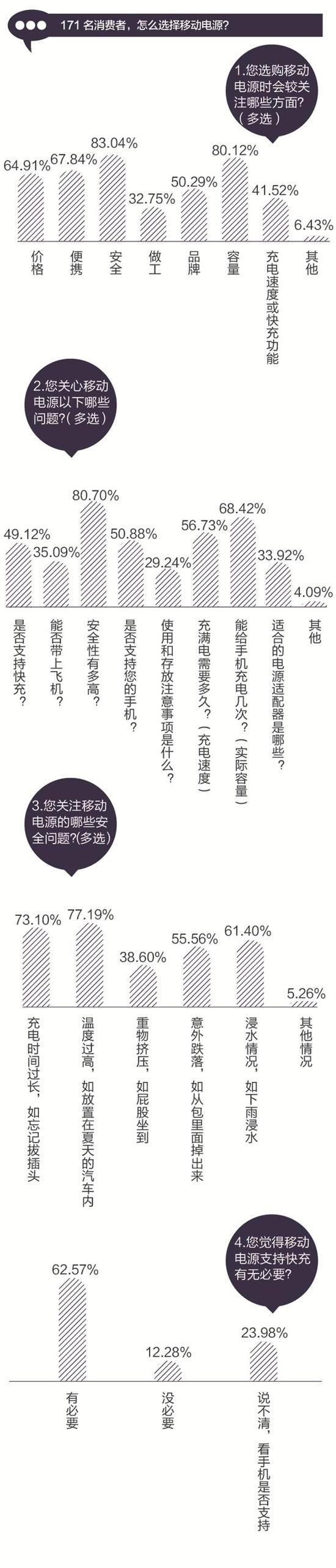 根据本刊进行的关于移动电源选购的调查问卷显示,消费者对移动电源安全问题比较关注。171名受访者中,56%的人担心意外跌落后造成的安全隐患,77%的人担心温度过高下的安全使用问题。