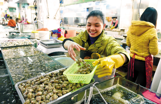 ■3月底,在广西南宁一家农贸市场,一名水产类档口档主给顾客捡螺。近日,全国多个城市猪肉价格上涨,带旺水产类、家禽生意。 新华社发