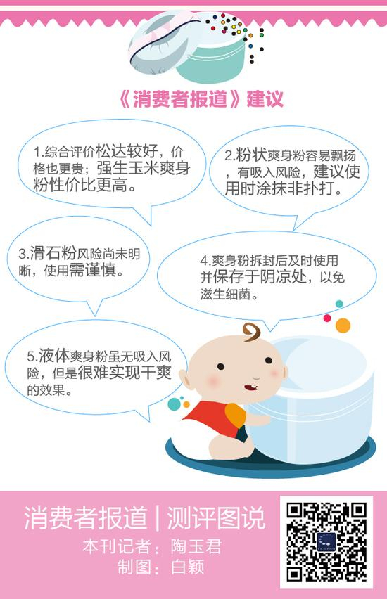 本刊建议消费者谨慎使用滑石粉类爽身粉,尤其需要注意的是,在给女婴下体大腿两内侧涂粉时,不要让粉体随意接触外阴唇,儿童鼻口也要远离滑石粉产品。