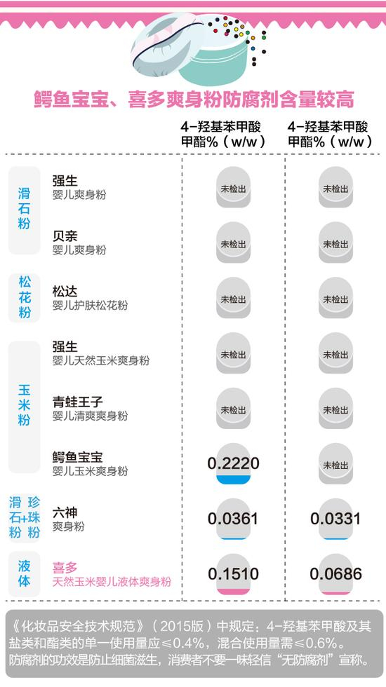 测评报告二:贝亲吸入风险较高 喜多液体爽身粉防腐剂用量相对更高