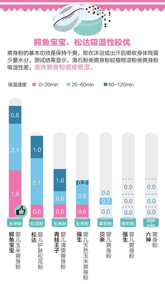 测评报告三:鳄鱼宝宝、松达吸湿性较优 3款玉米粉类爽身粉相对更“爽滑”