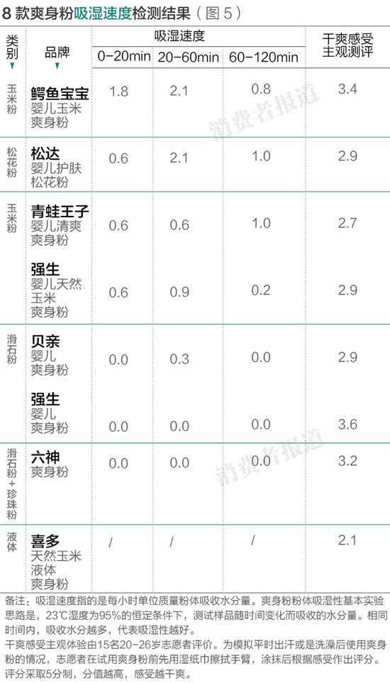 2016年5月,《消费者报道》向第三方权威检测机构送检强生、贝亲、六神、松达、鳄鱼宝宝、青蛙王子、喜多等7品牌8款爽身粉,检测其吸湿效果以及爽身粉在皮肤上的“爽滑”效果。