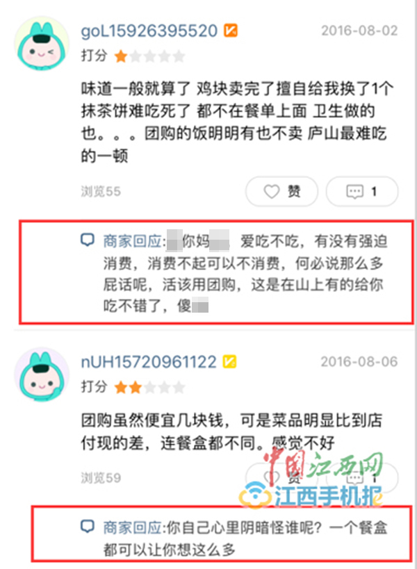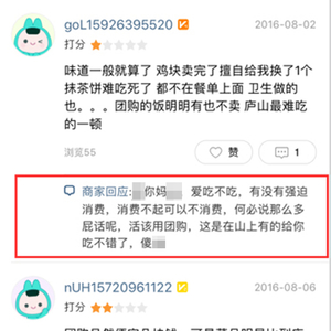 例如顾客说服务员态度特别差,商家回复:“X你妈X,爱吃不吃,有没有强迫消费,消费不起可以直说,活该用团购,这是在山上有的给你吃不错了,傻X。”言辞激烈。