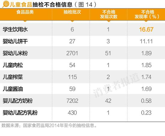 《消费者报道》通过梳理国家食药监局2014年以来的12551条儿童食品抽检数据发现,儿童食品的合格率较高,达99%,而不合格品牌也是较为小众品牌。本刊提醒消费者谨慎购买奶粉不合格次数较多的几个品牌,如雅因乐、冠尔优等。