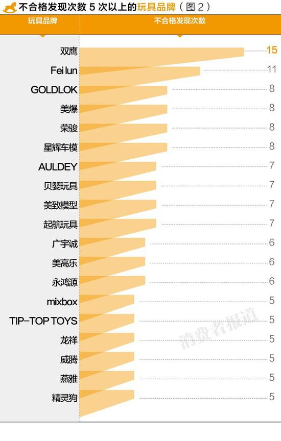 双鹰与飞轮的不合格次数超过10次,而美高乐、星辉车模等较知名品牌也数次登上黑榜。儿童玩具的抽检不合格项目主要集中在标志与危险警示不规范、以及小零件、尖端伤害等方面。