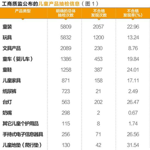 抽检数据显示,儿童产品的质量情况不容乐观,整体不合格发现率高达16.6%。童装、玩具、文具用品、童车等一直是质监抽查部门重点监管的对象,而童装、童鞋、台灯、手持式电子信息器具(如学习机、早教机等)、儿童爬行垫等类型产品的不合格发现率均超过20%。整体而言,儿童产品在标识、危险尖端与零件上存在更多的问题。