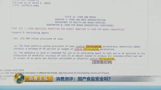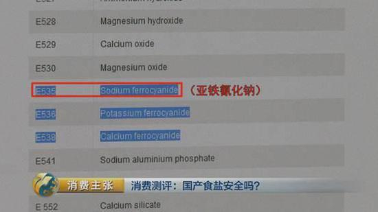 中华预防医学会健康传播分会常务委员 钟凯:在国际标准当中,亚铁氰化钠、亚铁氰化钾、亚铁氰化钙都是可以用于食盐抗结,那么它还没有做限量规定,在美国标准当中,亚铁氰化钠是可以用于食盐抗结。
