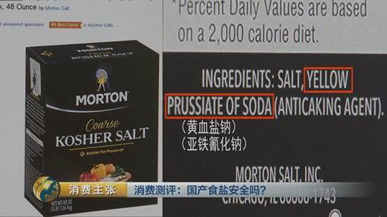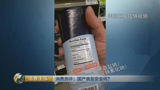 在美国网友提供的视频中,美国超市里售卖的莫盾牌的一款海盐标明含有亚铁氰化钠。