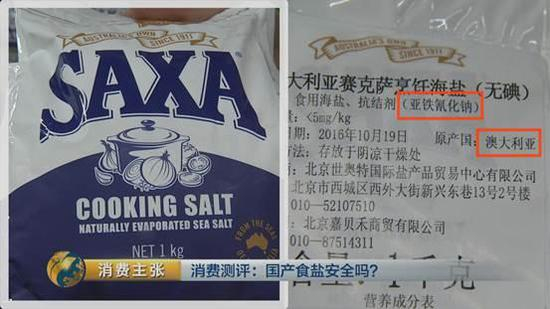 记者在北京的一家大型连锁超市里看到,这里售卖的进口食盐有3种,这3种食盐均为海盐,除一款澳洲海盐标明没有添加抗结剂外,另外两种进口盐并没有明确标明食盐成分里是否含有亚铁氰化钾。
