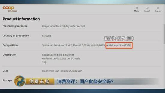而在另一个国外购物网站上,我们还发现了一款产自瑞士的名为Jurasel牌的食盐,它的成分表中明确标明含有亚铁氰化钾,这也是国产食盐中最常添加的抗结剂。