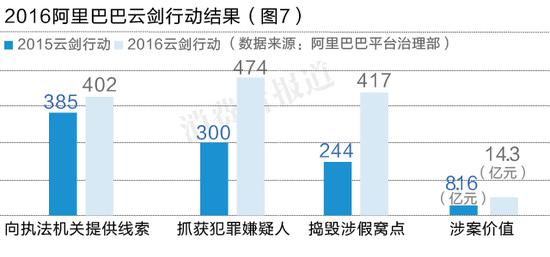 随着电商行业的快速发展,不少假货通过网上渠道进行销售。作为全国最大的电商平台,淘宝也经常被爆出有商家在售假。截止2016年12月31日,阿里巴巴平台治理部表示,已向执法机关推送线索1184条,协助公安机关抓获犯罪嫌疑人880名,捣毁涉假窝点1419个,涉案总价值超30亿元。(如图7)
