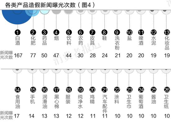 《消费者报道》整理累计被曝光数量10次以上的具体产品发现,白酒以167次造假曝光量排名第一,化肥以77次位居第二。(如图4)
