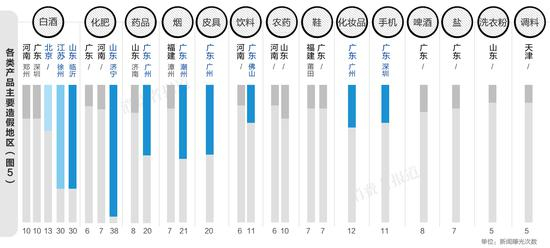 数据显示,14类主要造假产品类型的生产地大多来自——广东(11次)和山东(5次),此外还有河南(4次)、福建(2次)。(如图5)