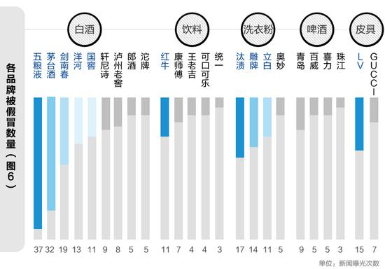功能饮料“红牛”也多次被爆出造假,其中仅广东佛山市就被查获3次。汰渍、立白、雕牌洗衣粉在多省均有被造假。LV成皮具被仿冒的宠儿,造假地主要集中在广东。太太乐鸡精被假冒提及次数达到9次。手机品牌则主要为苹果、三星。耐克、阿迪达斯为主要鞋造假牌子。(如图6)
