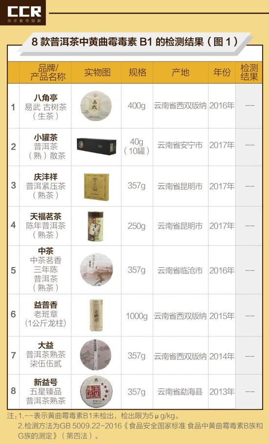 2017年9月,消道长送检了口碑颇高的大益、小罐茶、老班章、庆沣祥等8款普洱生茶、熟茶,检测指标为黄曲霉毒素B1。