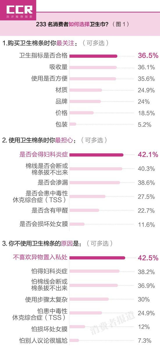 《消费者报道》针对233名消费者有关卫生棉条的调查问卷结果显示,约 40%的女性比较担心使用棉条会得妇科病,或棉条断裂、拔不出;而卫生情况、吸收量等是消费者选购卫生棉条的要素;除此之外,还有42.5%的女性不喜欢异物置入私处的感觉。(如图1)
