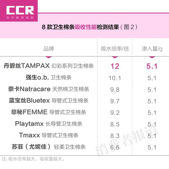 检测结果显示,吸收性能最强的是丹碧丝TAMPAX,其吸水倍率为12倍,是最低苏菲的约2倍。(如图2)