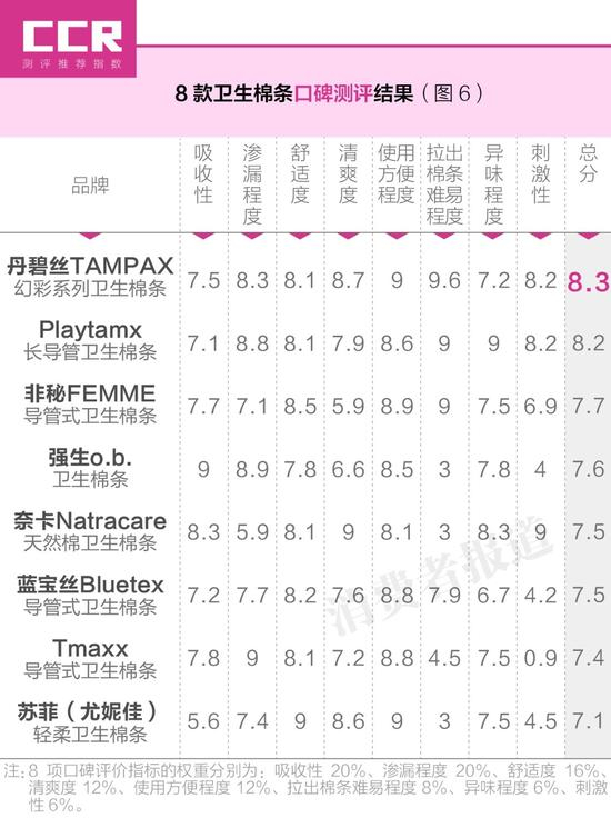 本刊综合8款棉条的实验室检测数据、口碑评价、主观体验及性价比等四方面进行了CCR测评推荐指数排名。