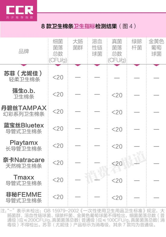 检测结果显示,8款棉条微生物指标均符合标准,卫生情况良好。其中,苏菲轻柔卫生棉条卫生安全指标为消毒级,相比普通级的要求更为严格。(如图4)