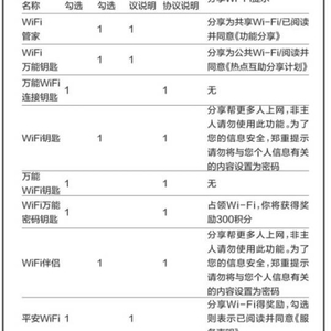 比如“WiFi管家”在《功能分享》中提及,用户应当保证分享、提交的信息系真实、准确、有效、安全,且有权对相关信息进行分享、提交,不会造成其他用户对公共W iFi的误认,亦不会侵犯他人的合法权益:“平安W iFi”则干脆表示,不对共享Wi-Fi的真实安全性等作出承诺和保证。