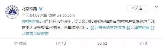 8月13日3时59分,受大风刮起彩钢板撞击造成的京沪高铁廊坊至北京南间设备故障已排除,列车恢复运行。