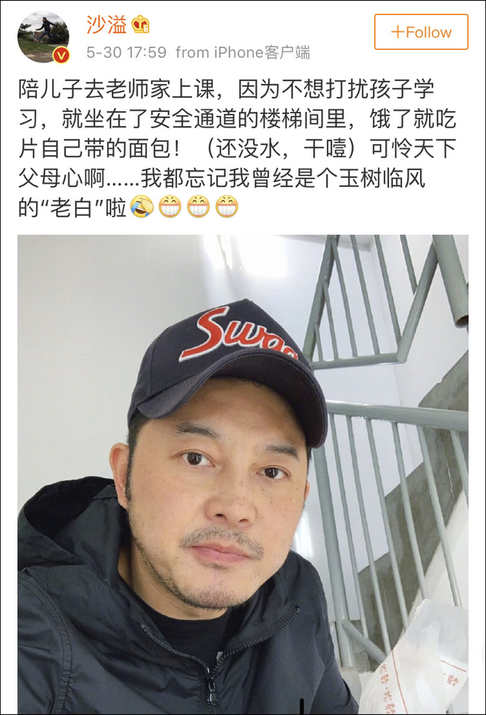 5月30日,@沙溢 在微博分享了一张自己陪儿子去老师家上课的照片,并透露因为不想打扰孩子学习,就坐在了安全通道的楼梯间里,饿了就吃片自己带的面包(还没水,干噎)。