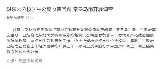 据报道,秦皇岛市场监督管理局一名工作人员告诉记者,鹏远公寓此次发生的收费风波,与东北大学无关。鹏远公寓属于社会力量办的公寓,学生自愿进行选择,至于收费标准是否合理,不由市场监督管理局负责。