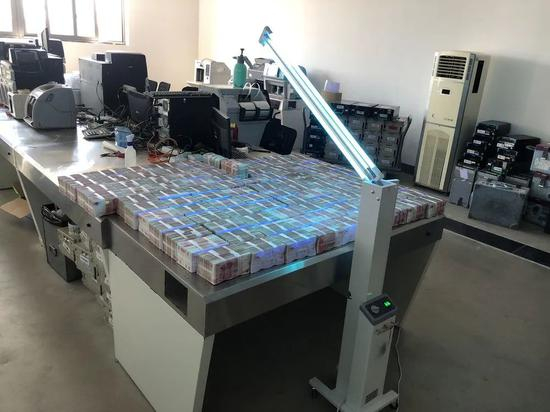 3、清点结束后,现金将进行紫外线灯照射消毒,消毒灯工作时网点人员离场,同时使用酒精或84消毒液对出纳机进行擦拭消毒处理。