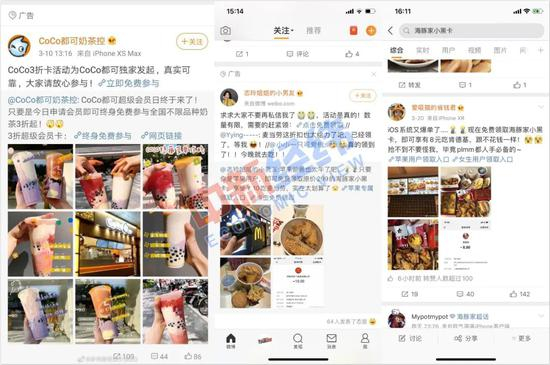 消费者小宋平时刷微博经常能看到一些营销号推广“免费领海豚家小黑卡”的活动。“这些营销号看上去活跃度很高,比如有‘志玲姐姐后援会’‘爱吸猫的省钱君’‘志玲姐姐的小男友’等,它们的推广文案也很类似,比如免费领取海豚家小黑卡,即可享受几元吃肯德基、麦当劳,9.9元喝星巴克,3折喝CoCo奶茶等等,最后再附一个网页链接,点进去就可以办理了。”小宋介绍。